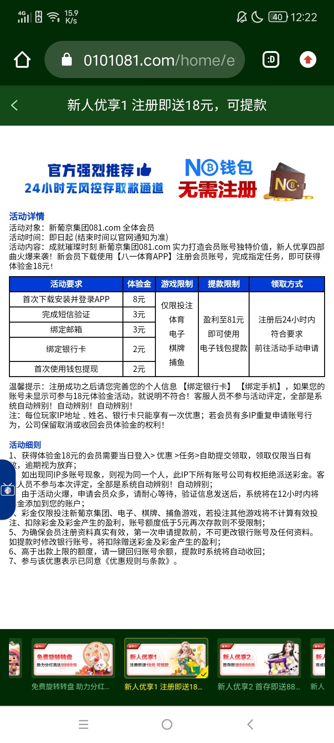 新用户注册绑卡,优惠里有小任务完成18元,玩到81提款,最高提现81元,出款自测!